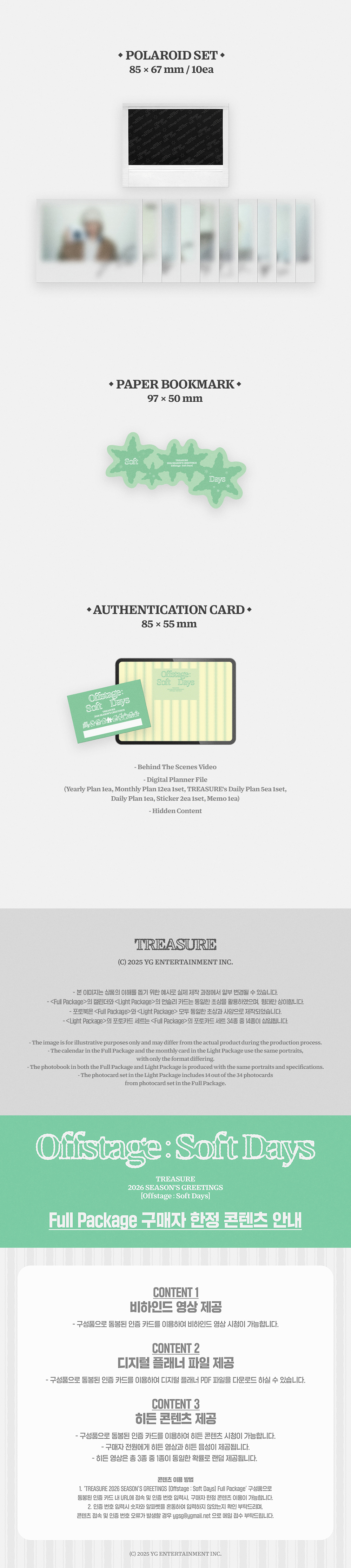 1. ‘TREASURE 2026 SEASON’S GREETINGS [Offstage : Soft Days] Full Package’ 구성품으로 동봉된 인증 카드 내 URL에 접속 및 인증 번호 입력 시, 구매자 한정 콘텐츠 이용이 가능합니다.